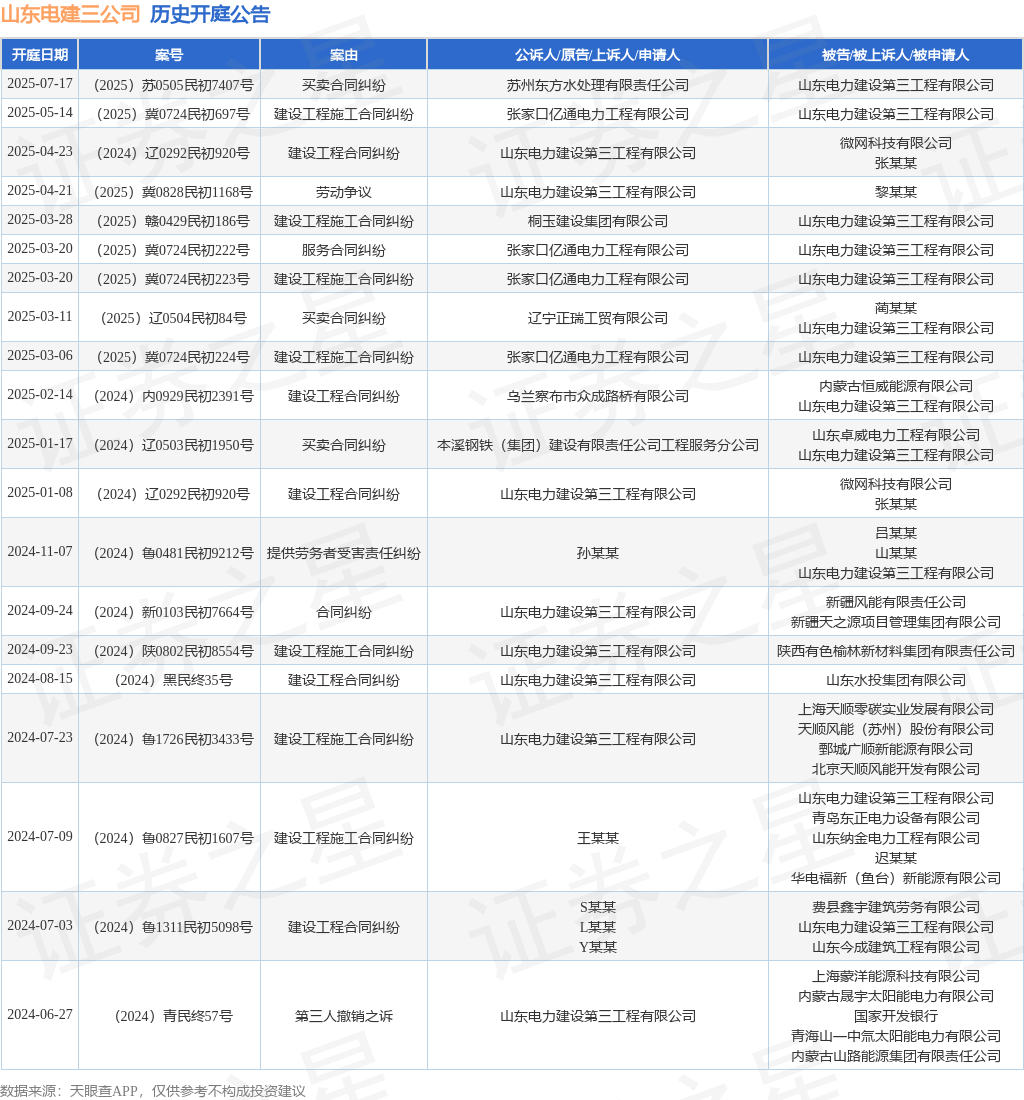 案号:(2025)冀0724民初697号审理法院:沽源县人民法院案由:建设工程施工合同纠纷当事人信息: 原告/上诉人:张家口亿通电力工程有限公司 被告/被上诉人:山东电力建设第三工程有限公司开庭日期:2025年5月14日根据统计,近一年内以山东电力建设第三工程有限公司为当事人的历史开庭公告有25则,其中案由为“建设工程施工合同纠纷”的公告以8则居首,其次为“建设工程合同纠纷”有5则,“买卖合同纠纷”有3则。历史开庭公告(前20条)如下: